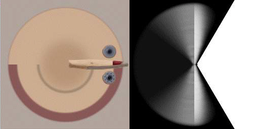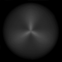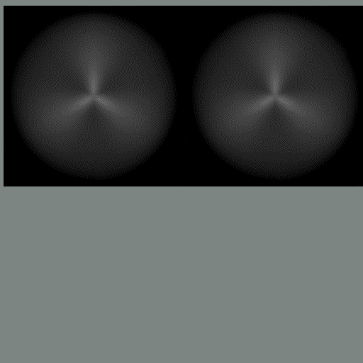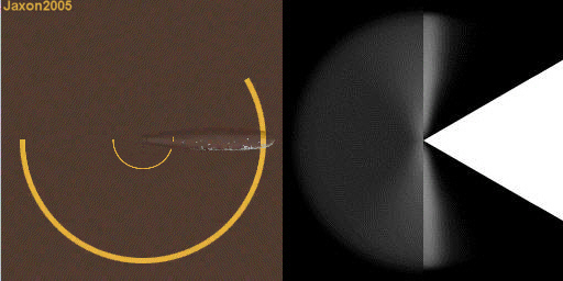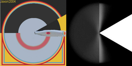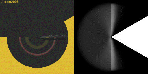 Next, to compare, the prop_sopwith.bmp, to find in the same folder. The areas are more or less the same, only the white triangle is wider. Of course the WW I Sopwith has a relative slow moving propeller. Thus meaning it is better visible when moving and for a longer part of the turn. Result: The areas are brighter (less transparent) and wider (longer visible) |