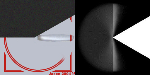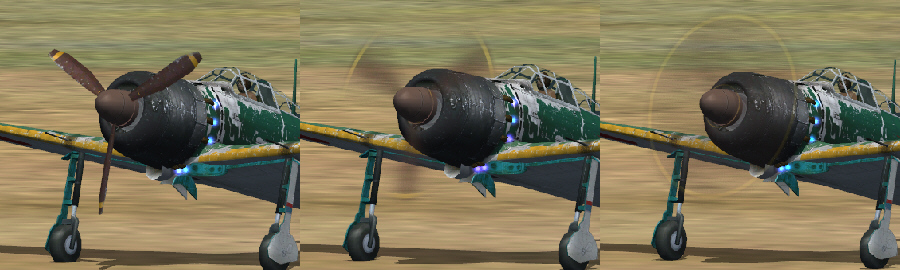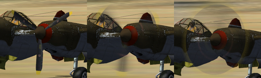 find on different textures. The stillstanding prop is mostly painted somewhere on the main texture (fuselage) or that one with generic parts. The fast moving prop is made from an entire disc with corresponding alphachannel. If there is a slow moving propeller modelled, it normally is made like the fast one, but with another alpha using the same technique as mentioned in the M$ section. |