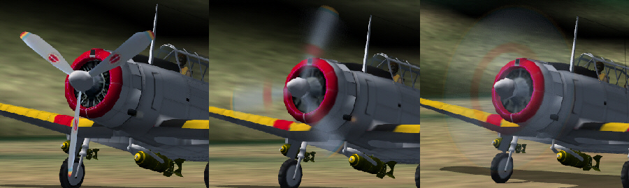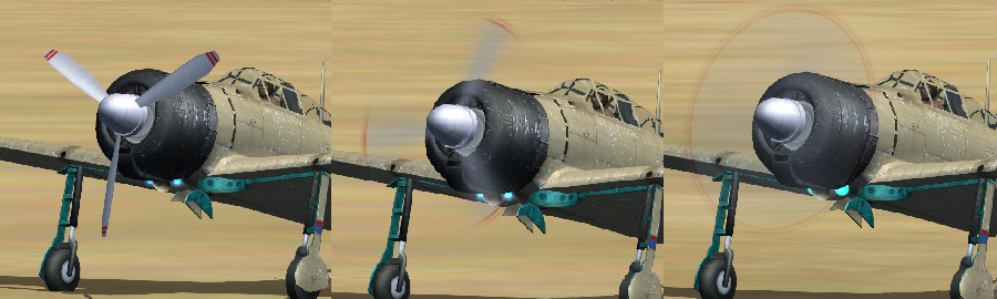 The Microsoft flightsims including CFS2 use just one texture for the standing, slow moving and fast moving propeller. This is very framerate-friendly, the lesser information the game has to handle, the better. For the same reason the stock CFS2 propeller-textures are both in the main folder, because all planes use the same texture (well, Jap. and US one) |